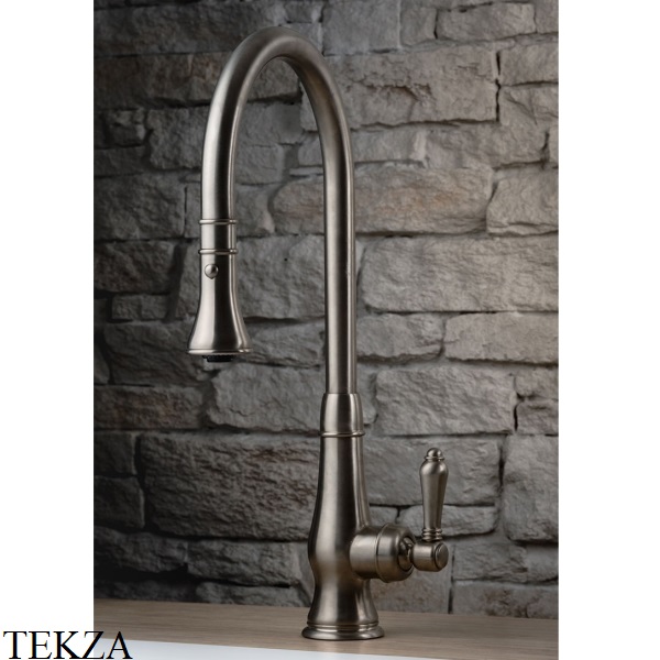 - Nicolazzi Cucina Смеситель для кухни с изогнутым изливом и отдельным душем – изделия в стиле «ретро» в темном оттенке идеально впишутся в роскошные интерьеры санузла.