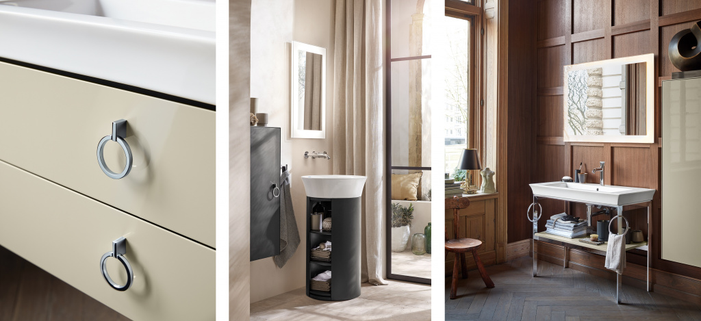 Выполненная в том же стиле круглая раковина над столешницей впечатляет своим эстетичным изящным скошенным краем. Прямоугольный умывальник, если посмотреть сверху, также отражает эту характерную форму. Он доступен в двух размерах, в качестве умывальника для мебели и умывальника для рук.