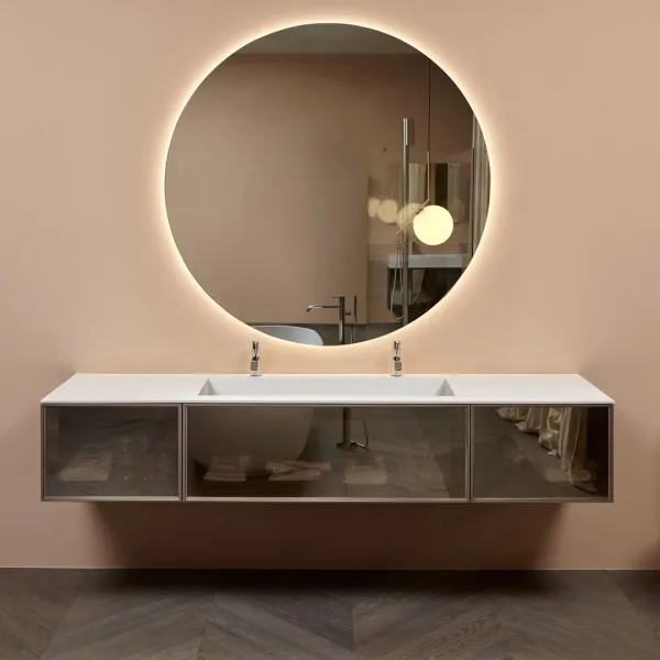 Свобода решений гарантирована и в вопросе дизайна. Вы можете купить модульную мебель Antonio Lupi BESPOKE со шпонированными панелями, отделанными в интересном для вас цвете, с прозрачными стеклянными, с эффектными рельефными. Вам решать, что будет лучше соседствовать с премиальной сантехникой.