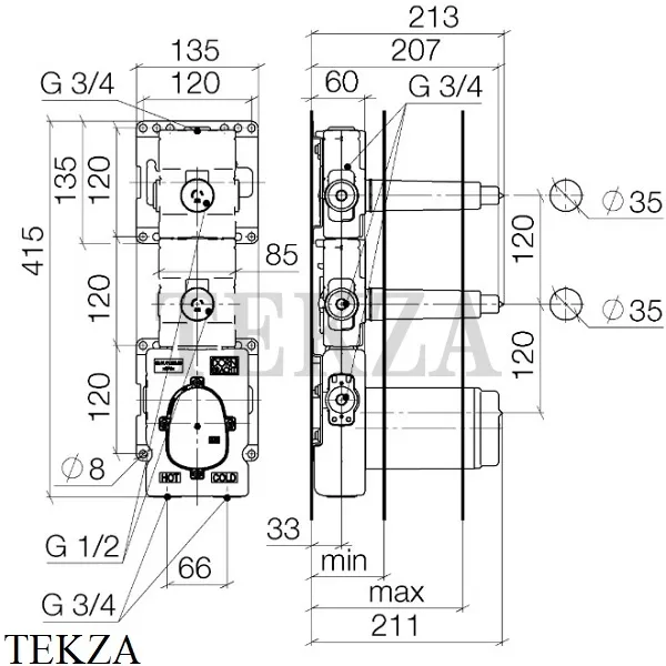 2x подключение питания 3/4 "внутренняя резьба (холодная / горячая), DN 15