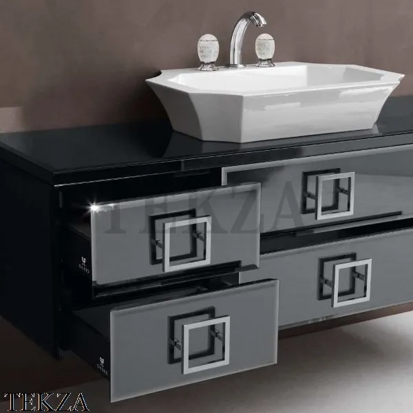 Раковины изготовлены из полимерных смол высокой плотности с защитном гелиевым слоем в глянцевой белой отделке. Столешницы с интегрированными раковинами из стекла 10 мм.