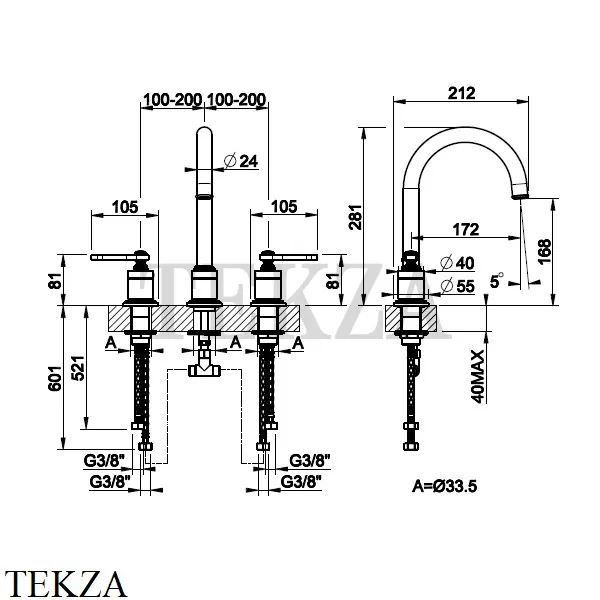 Смеситель для раковины на 3 отверстия зонтичный Gessi VENTI20, без донного клапана