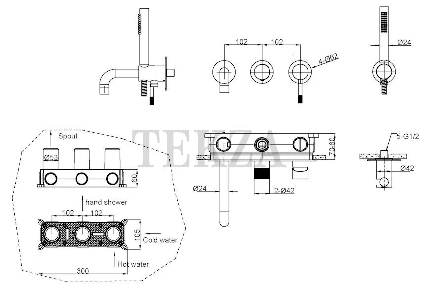Смеситель встроенный для ванны + ручной душ + излив Boheme Uno 464-3-MW Matt White.