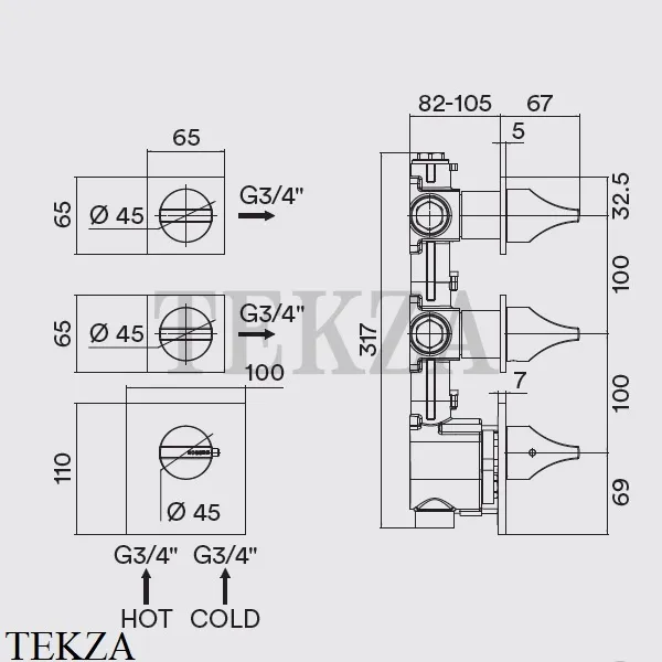 Термостат для душа Bossini APICE на 2 и 3 потока, с отдельными розетками, внешняя часть.