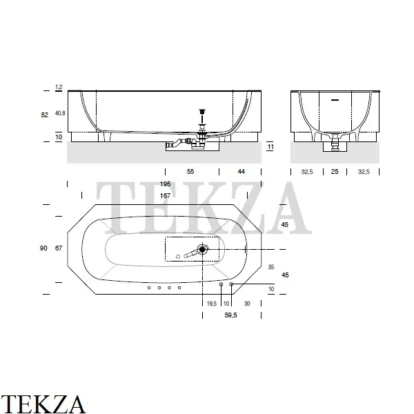 Вес ванны 100 кг, вместимость воды до ровня перелива 259 литра