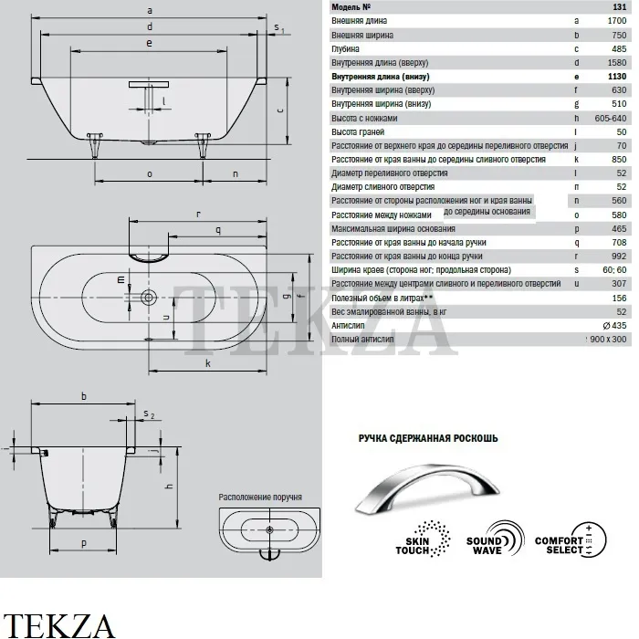 Ванна изготовлена из 3,5 мм стали и покрыта белоснежной эмалью.