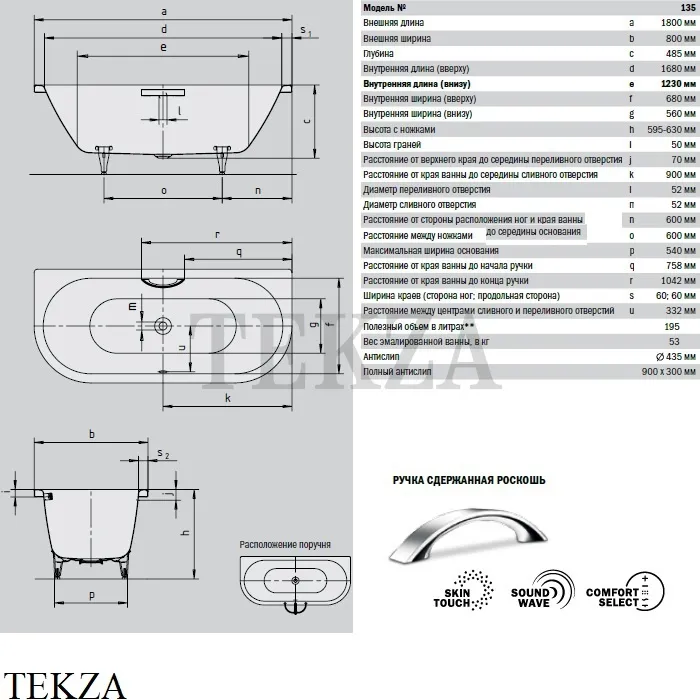 Ванна изготовлена из 3,5 мм стали и покрыта белоснежной эмалью.
