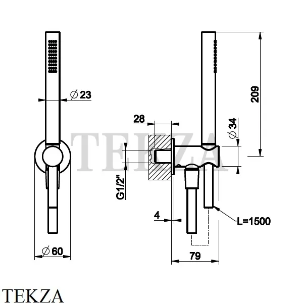 Шланг 1,50 м, душевая лейка с защитой от известкового налёта, держатель с выводом.